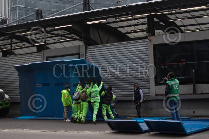 Trabajadores del gobierno capitalino blindaron la estación del Metrobus Insurgentes ante una posible manifestación de mujeres en las inmediaciones de la Secretaría de Seguridad Ciudadana.