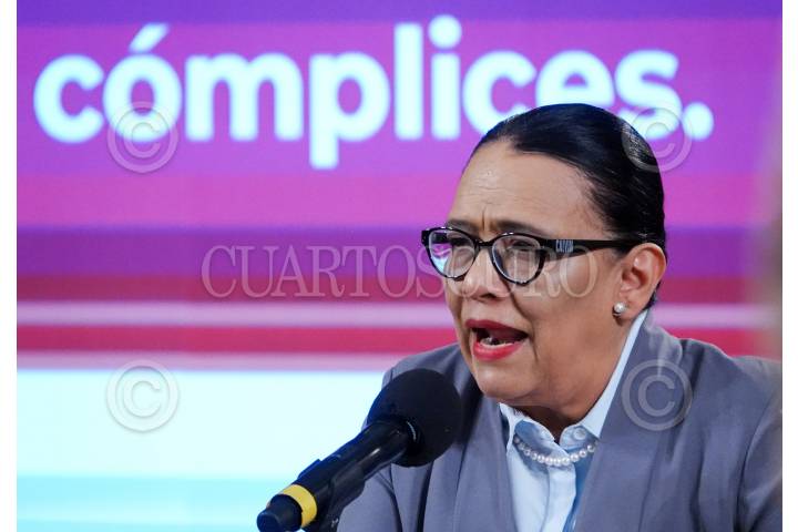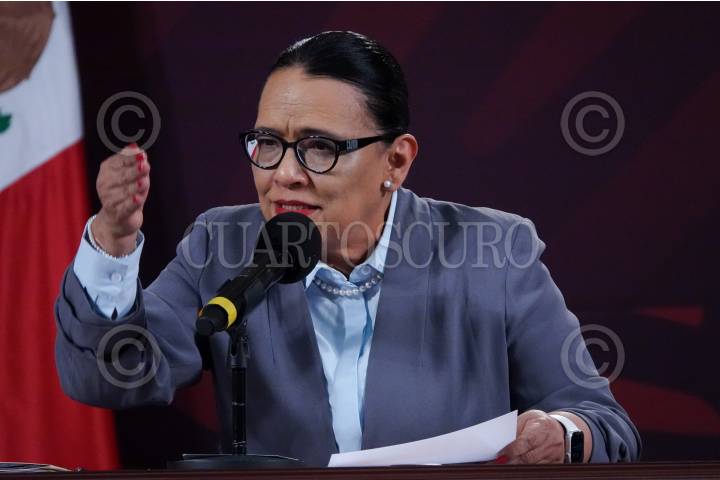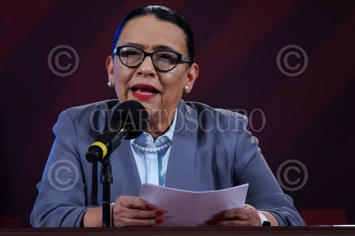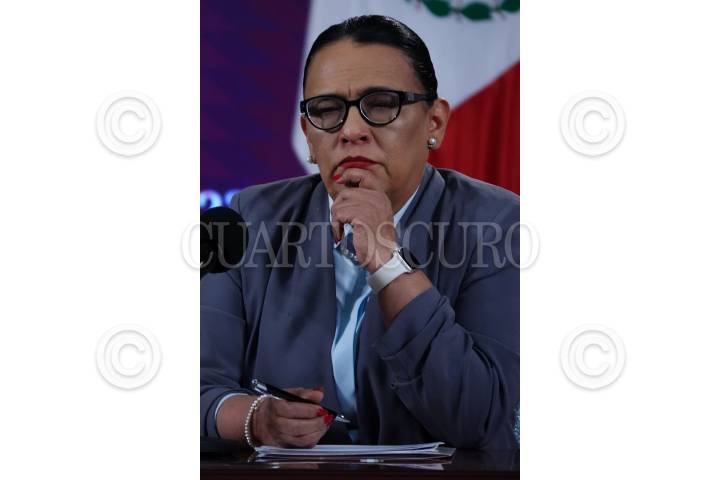 Rosa Icela Rodríguez durante la tercera conferencia del informe sobre el caso de la estación migratoria en Ciudad Juárez, Chihuahua, desde Palacio Nacional.