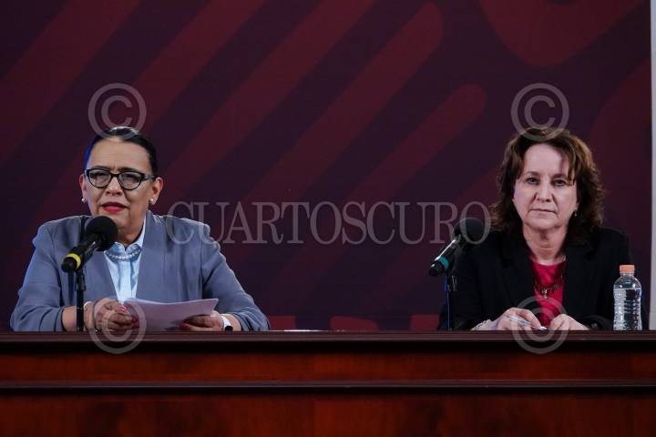 Rosa Icela Rodríguez y Sara Irene Herrerías Guerra durante la tercera conferencia del informe sobre el caso de la estación migratoria en Ciudad Juárez, Chihuahua, desde Palacio Nacional.