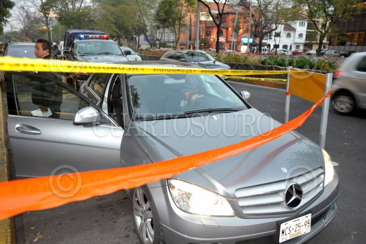 MÉXICO, D.F., 10ENERO2010.- Un sujeto de origen Libanés, de nombre Manuel Ceades Gutiérrez de 31 años, perdio la vida abordo de su auto Mercedes Benz de color gris con placas MCS-25-91 que se encontraba estacionado frene a la Plaza comercial Antara, ubicada en Ejercito Nacional a la altura de la calle Moliere en Polanco, perímetro de la Delegación Miguel Hidalgo. Este se encontraba discutiendo por cuestiones de dinero abordo del auto con su hermano de nombre José Ceades de 28 años, por lo que saco una arma 9 mm y le disparo en por lo menos una ocasión en la cabeza, al lugar arribo la unidad número 14 de Cruz Roja para certificar la muerte de este sujeto y peritos de la agencia numero 9 de la procuraduría para realizar el levantamiento del cadáver. FOTO: LUIS CARBAYO/CUARTOSCURO.COM