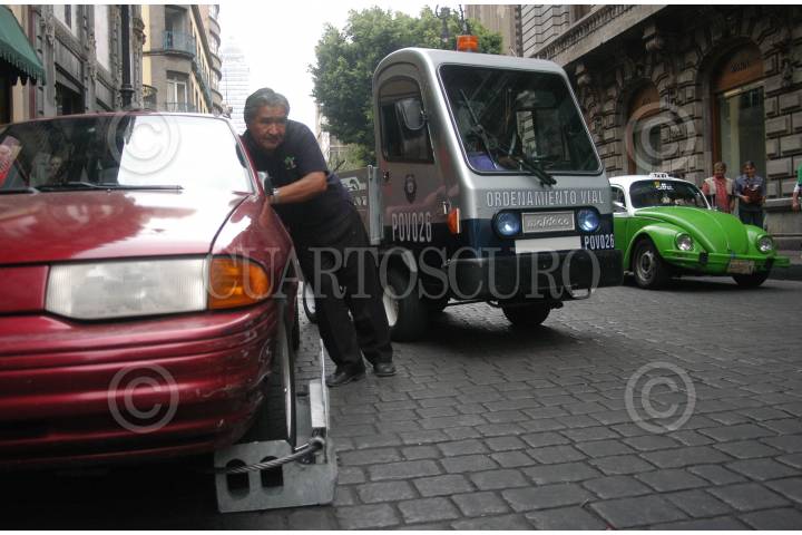 MÉXICO D.F. 03ABRIL2007.-Un señor retira las llaves de su auto, después de que le colocaron la araña por estar estacionado en zona prohibida en las calles del centro. FOTO: GUILLERMO PEREA/CUARTOSCURO.COM
