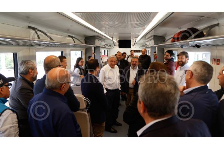 CUAJIMALPA, CIUDAD DE MÉXICO, 27FEBRERO2024.- Andrés Manuel López Obrador, presidente de México, en compañía de Jorge Nuño Lara, secretario de Comunicaciones y Transportes, y Delfina Gómez, gobernadora de Toluca, realizaron la supervisión del trayecto del Tren Insurgente hasta la estación Santa Fe. Según un comunicado en las redes sociales del presidente, se espera que este nuevo sistema de transporte comience a operar al cien por ciento en agosto del presente año y conectará la estación Zinacantepec (Estado de México) hasta Observatorio (CDMX). FOTO: PRESIDENCIA/CUARTOSCURO.COM