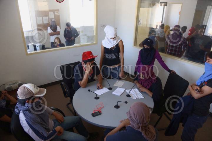 CHILPANCINGO, GUERRERO 01NOVIEMBRE2014.- Estudiantes de la escuela normal rural de Ayotzinapa tomaron por unas horas estaciones de radio ubicadas en el centro de Chilpancingo para difundir un mensaje a la población ante la desaparición de los normalistas desaparecidos en Iguala. FOTO: SAÚL LÓPEZ /CUARTOSCURO.COM