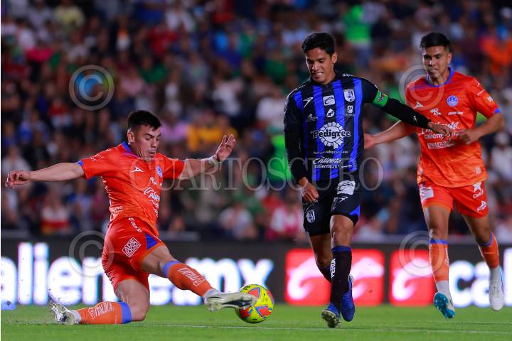 QUERÉTARO, QUERÉTARO, 14MARZO2025.- Facundo Almada del Mazatlan y Jaime Gomez del Queretaro durante el partido de la jornada 12 del Torneo Clausura 2025 de la Liga BBVA MX en el Estadio Corregidora el 14 de Marzo de 2025 en Queretaro. FOTO: CÉSAR GÓMEZ/CUARTOSCURO.COM