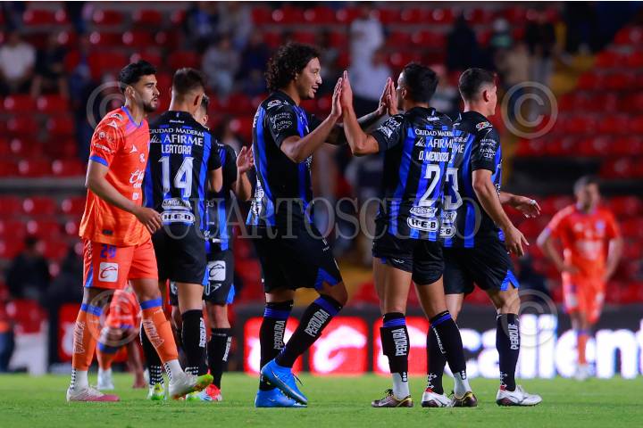QUERÉTARO, QUERÉTARO, 14MARZO2025.- Jugadores de Queretaro en festejo durante el partido de la jornada 12 del Torneo Clausura 2025 de la Liga BBVA MX en el Estadio Corregidora el 14 de Marzo de 2025 en Queretaro. FOTO: CÉSAR GÓMEZ/CUARTOSCURO.COM