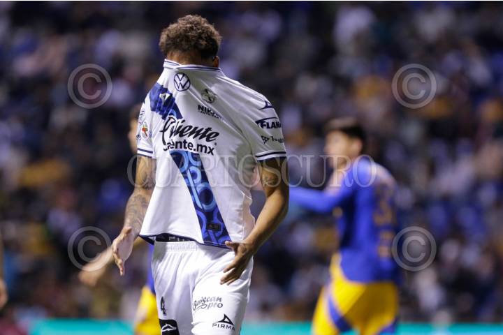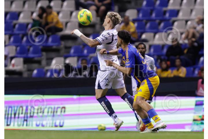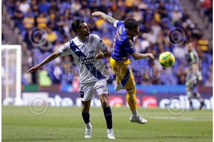 PUEBLA, PUEBLA, 04ABRIL2025.- Emiliano Gomez y  Vladimir Eduardo Loroña durante el partido entre el Club Puebla y los Tigres de la UANL, correspondiente a la jornada 14 del torneo Clausura 2025 de la Liga BBVA MX, celebrado en el Estadio Cuauhtémoc.  FOTO: MIREYA NOVO/CUARTOSCURO.COM