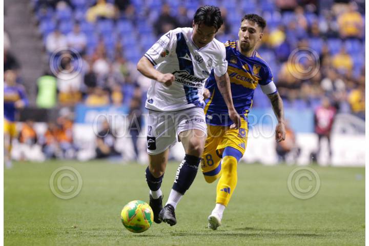 PUEBLA, PUEBLA, 04ABRIL2025.- Ricardo Marín y Fernando Gorriarán  durante el partido entre el Club Puebla y los Tigres de la UANL, correspondiente a la jornada 14 del torneo Clausura 2025 de la Liga BBVA MX, celebrado en el Estadio Cuauhtémoc.  FOTO: MIREYA NOVO/CUARTOSCURO.COM