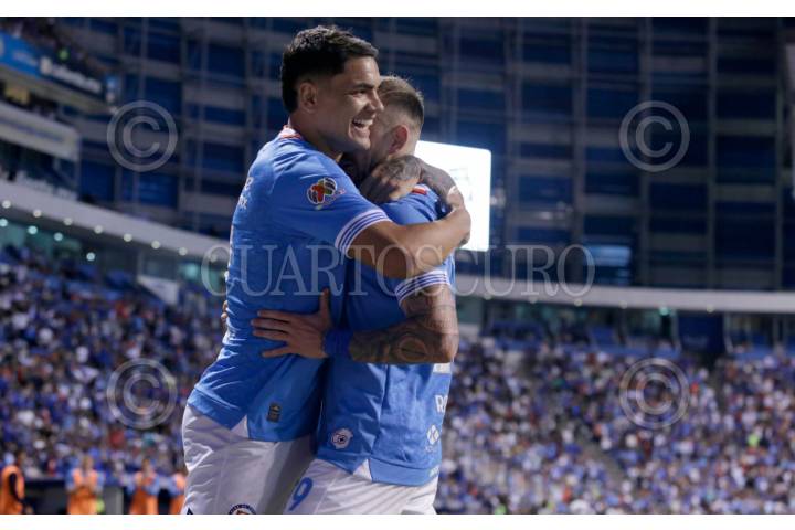 PUEBLA, PUEBLA, 5ABRIL2025.-  Jugadores en festejo de gol durante el partido entre la Máquina Celeste del Cruz Azul y los Pumas de la UNAM, correspondiente a la jornada 14 del torneo Clausura 2025 de la Liga BBVA MX, celebrado en el Estadio Cuauhtémoc.  FOTO: MIREYA NOVO/ CUARTOSCURO.COM