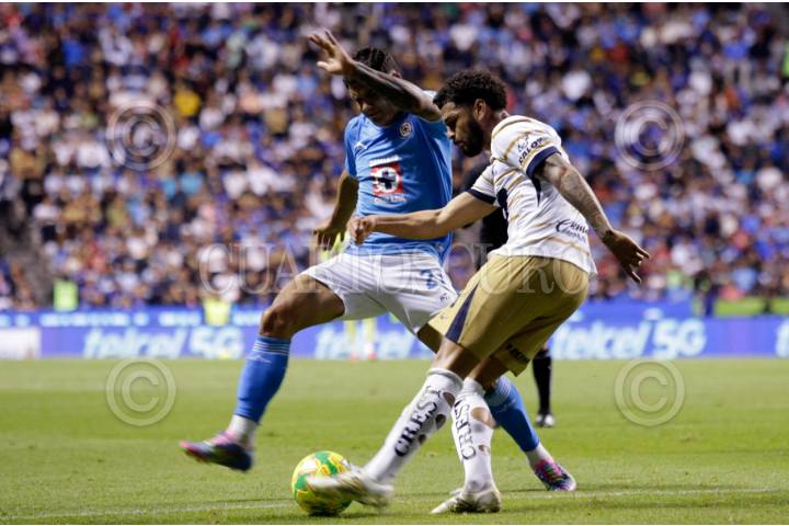 PUEBLA, PUEBLA, 5ABRIL2025.-  Gabriel Fernández y Riben Duarte durante el partido entre la Máquina Celeste del Cruz Azul y los Pumas de la UNAM, correspondiente a la jornada 14 del torneo Clausura 2025 de la Liga BBVA MX, celebrado en el Estadio Cuauhtémoc.  FOTO: MIREYA NOVO/ CUARTOSCURO.COM