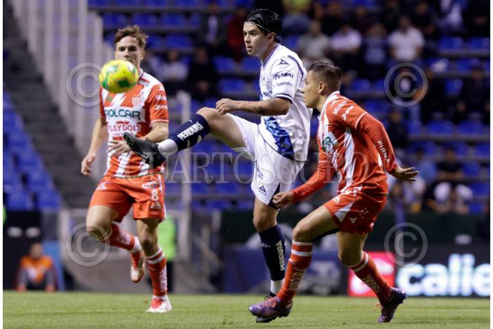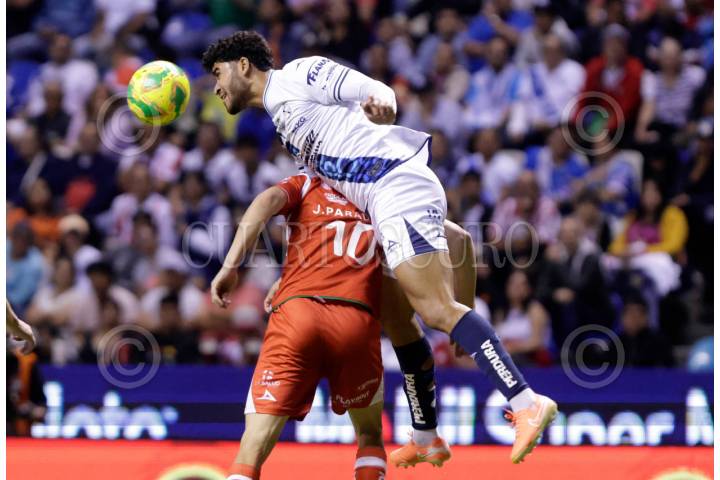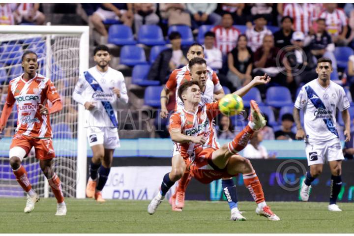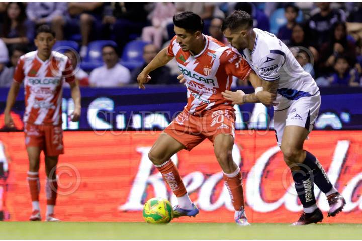 PUEBLA, PUEBLA, 18ABRIL2025.-  Ricardo Monreal y Juan Fedorco durante el partido entre entre el Club Puebla y los Rayos del Necaxa, correspondiente a la jornada 17 del torneo Clausura 2025 de la Liga BBVA MX, celebrado en el Estadio Cuauhtémoc.   FOTO: MIREYA NOVO/CUARTOSCURO.COM