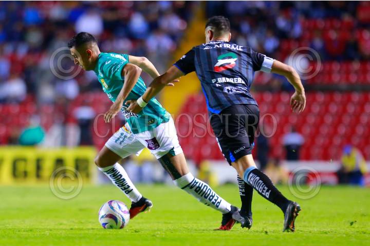 QUERÉTARO, QUERÉTARO, 29SEPTIEMBRE2023.- Federico Letora del Querétaro y Lucas Romero del León, durante el partido de la jornada 10 del Torneo Clausura 2023 de la Liga MX, en el estadio Corregidora. FOTO: CÉSAR GÓMEZ/CUARTOSCURO.COM