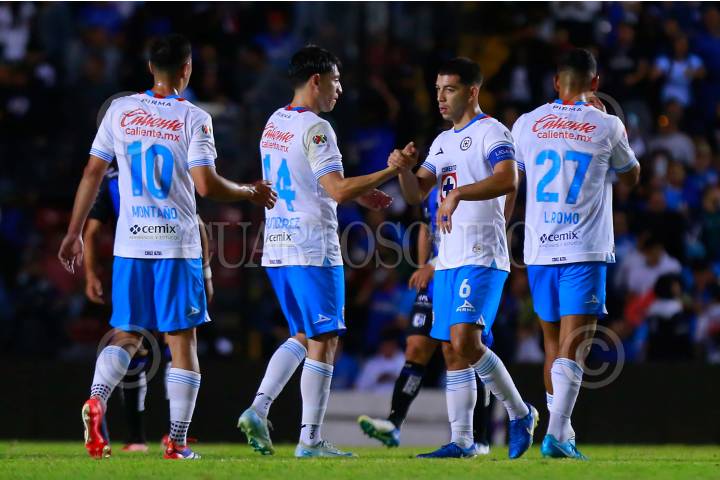 QUERÉTARO, QUERÉTARO, 24AGOSTO2024.- Jugadores del Cruz Azul en festejo durante el partido de la jornada 5 del Torneo Apertura 2024 de la Liga BBVA MX en el Estadio Corregidora. FOTO: CÉSAR GÓMEZ/CUARTOSCURO.COM