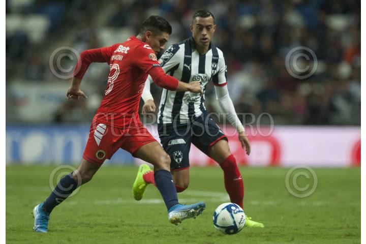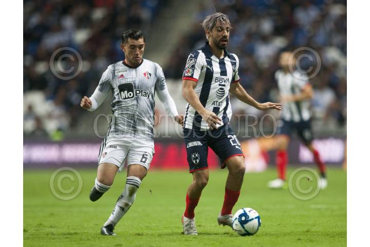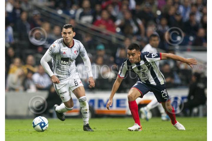 MONTERREY, NUEVO LEÓN, 23NOVIEMBRE2019.- Rodolfo Pizarro del equipo de los Rayados del Monterrey, se disputa el balón con Edgar Zaldívar del equipo de Atlas en el estadio BBVA Bancomer, partido correspondiente a la jornada 19 de la Liga MX, Apertura 2019. Marcador Final: Monterrey: 2 - Atlas: 0 FOTO: GABRIELA PÉREZ MONTIEL /CUARTOSCURO.COM