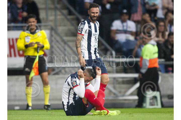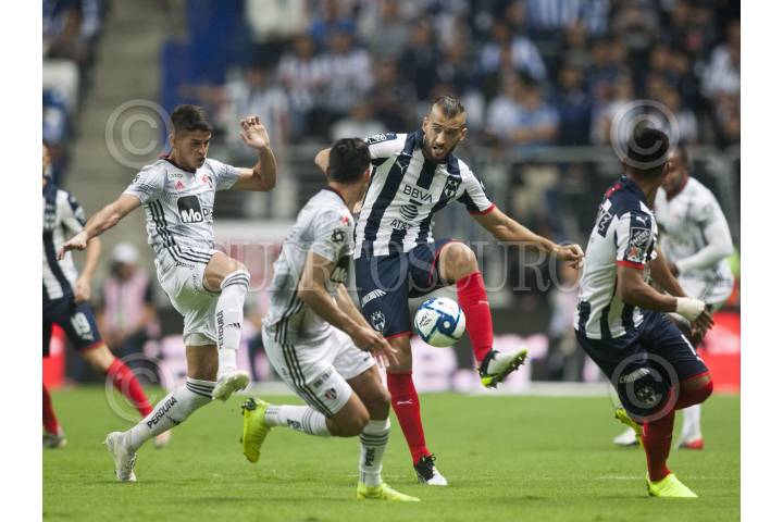 MONTERREY, NUEVO LEÓN, 23NOVIEMBRE2019.- Nicolás Sánchez del equipo de los Rayados del Monterrey, se disputa el balón con jugadores del equipo de Atlas en el estadio BBVA Bancomer, partido correspondiente a la jornada 19 de la Liga MX, Apertura 2019. Marcador Final: Monterrey: 2 - Atlas: 0 FOTO: GABRIELA PÉREZ MONTIEL /CUARTOSCURO.COM