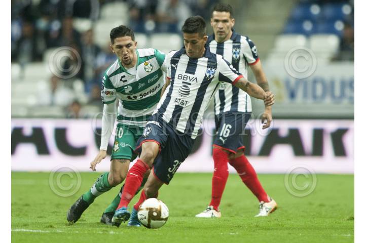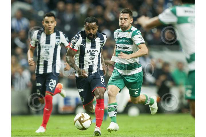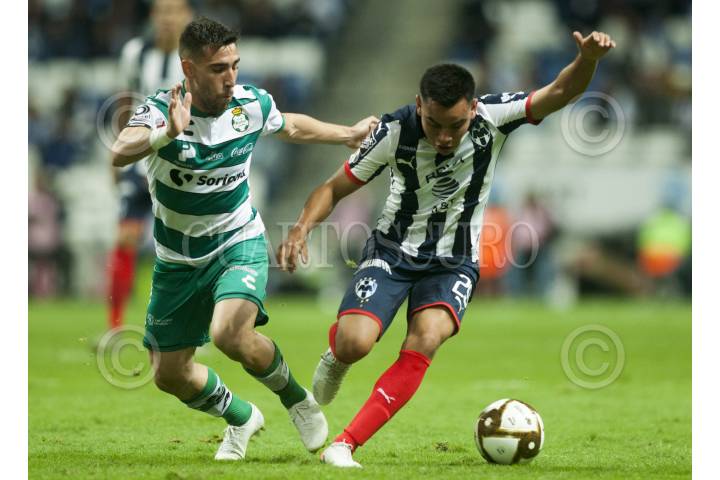 MONTERREY, NUEVO LEÓN, 28NOVIEMBRE2019.- Carlos Rodríguez del equipo de los Rayados del Monterrey, se disputa el balón con Fernando Gorriaran del equipo de Santos en el estadio BBVA Bancomer, partido correspondiente a cuartos de final en la Liguilla, Apertura 2019. Marcador Final: Monterrey: 5 - Santos: 2 FOTO: GABRIELA PÉREZ MONTIEL /CUARTOSCURO.COM