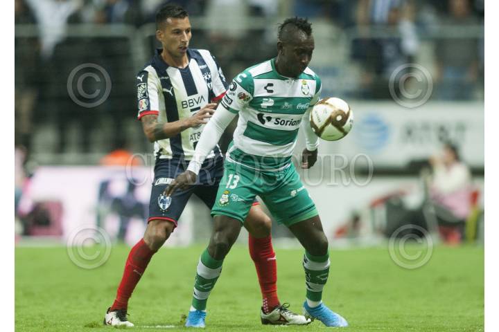 MONTERREY, NUEVO LEÓN, 28NOVIEMBRE2019.- Doran Pabón del equipo de los Rayados del Monterrey, se disputa el balón con Fernando Gorriaran del equipo de Santos en el estadio BBVA Bancomer, partido correspondiente a cuartos de final en la Liguilla, Apertura 2019. Marcador Final: Monterrey: 5 - Santos: 2 FOTO: GABRIELA PÉREZ MONTIEL /CUARTOSCURO.COM