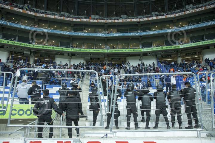 Elementos de Fuerza Civil del estado resguardan las tribunas del estadio BBVA Bancomer, durante el encuentro del Monterrey vs Mazatlán, partido correspondiente a la jornada 10 de la Liga Mx, Clausura 2022. Marcador Final: Monterrey: 2 - Mazatlán: 0