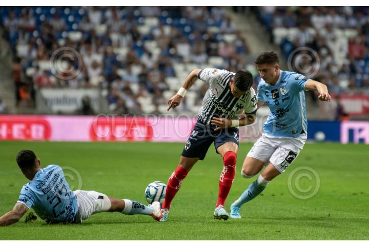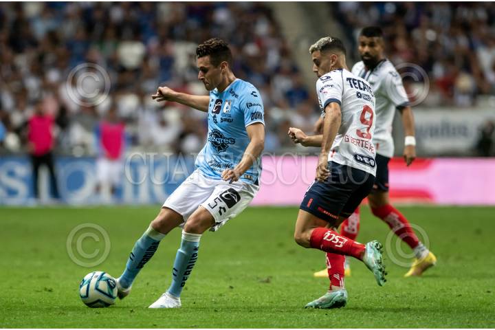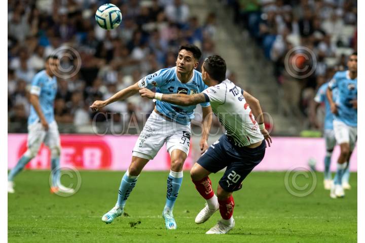 Maximiliano Meza de los Rayados del Monterrey, se disputa el balón con Christian Rivera de los Gallos del Querétaro, en el estadio BBVA, partido correspondiente a la jornada 7 de la Clausura 2023.