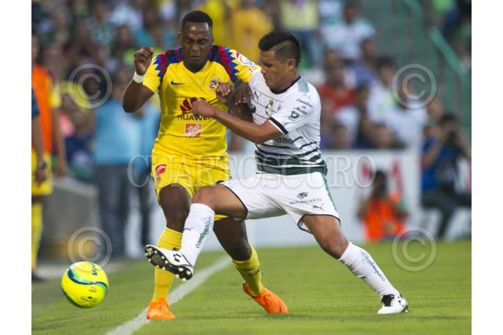 TORREÓN, COAHUILA, 10MAYO2018.- Osvaldo Martínez del equipo del Santos, se disputa el balón con Renato Ibarra del equipo de las Águilas del América, en el estadio Corona, partido correspondiente a semifinales de ida de la Clausura 2018 de la Liga MX. Marcador Final: Santos: 4 - América: 1 FOTO: GABRIELA PÉREZ MONTIEL /CUARTOSCURO.COM