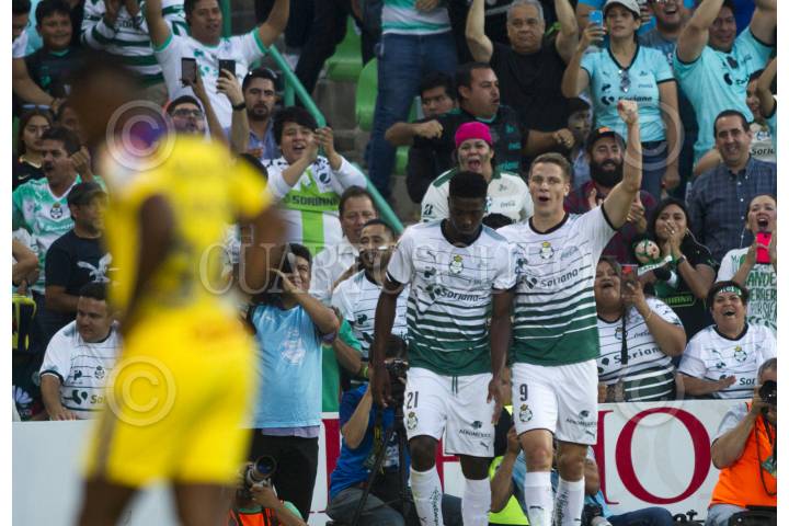 TORREÓN, COAHUILA, 10MAYO2018.- Jugadores del equipo del Santos, celebran el gol ante el equipo de las Águilas del América, en el estadio Corona, partido correspondiente a semifinales de ida de la Clausura 2018 de la Liga MX. Marcador Final: Santos: 4 - América: 1 FOTO: GABRIELA PÉREZ MONTIEL /CUARTOSCURO.COM