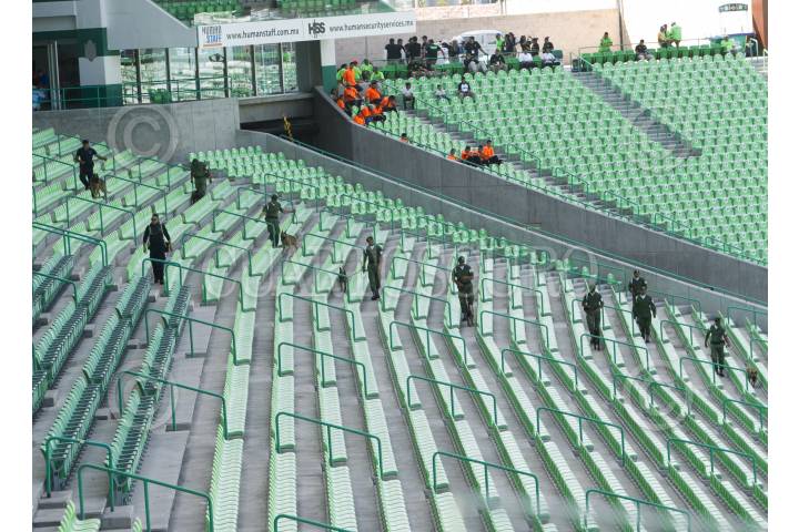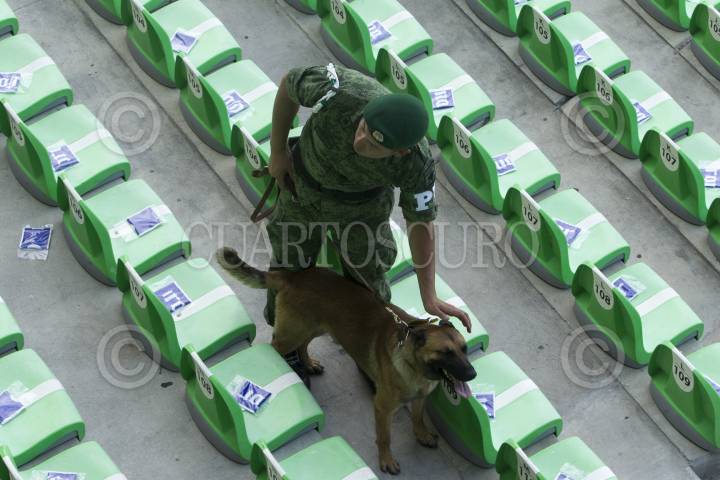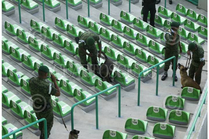 TORREÓN, COAHUILA, 17MAYO2018.- Policías militares y perros entrenados, revisan las gradas del estadio Corona previo al partido de ida de la final entre Santos vs Toluca. FOTO: GABRIELA PÉREZ MONTIEL /CUARTOSCURO.COM