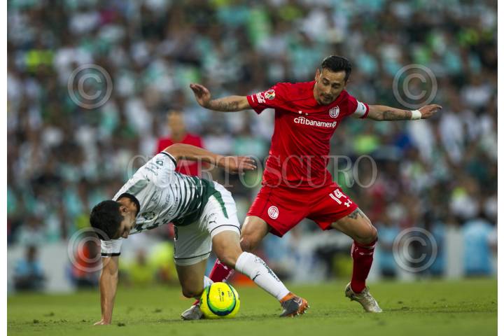 TORREÓN, COAHUILA, 17MAYO2018.- Julio César Furch del equipo de Santos, se disputa el balón con Rubens Sambueza del equipo de los Diablos del Toluca, en el estadio Corona, partido correspondiente a la final de ida de la Clausura 2018 de la Liga MX. Marcador Final: Santos: 2 - Toluca: 1 FOTO: GABRIELA PÉREZ MONTIEL /CUARTOSCURO.COM
