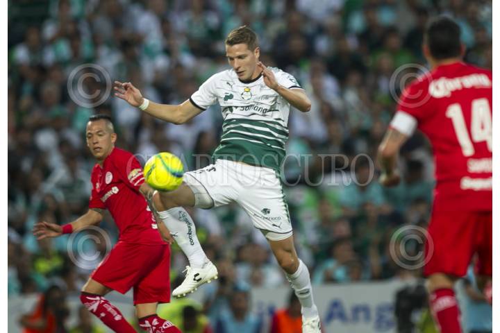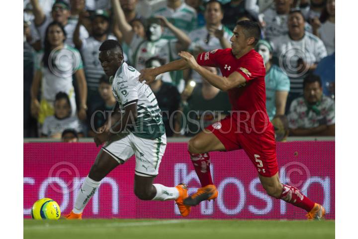 TORREÓN, COAHUILA, 17MAYO2018.- Jorge Djaniny Tavares del equipo de Santos, se disputa el balón con Osvaldo González del equipo de los Diablos del Toluca, en el estadio Corona, partido correspondiente a la final de ida de la Clausura 2018 de la Liga MX. Marcador Final: Santos: 2 - Toluca: 1 FOTO: GABRIELA PÉREZ MONTIEL /CUARTOSCURO.COM