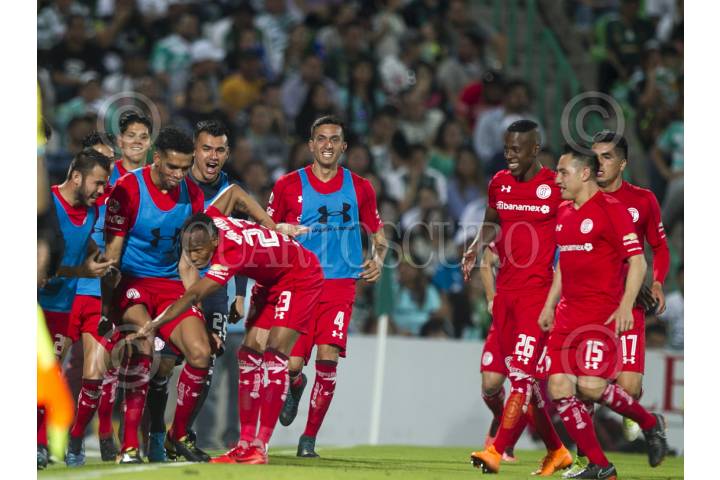 TORREÓN, COAHUILA, 17MAYO2018.- Jugadores del equipo de los Diablos del Toluca, celebran el gol, ante el equipo de Santos, en el estadio Corona, partido correspondiente a la final de ida de la Clausura 2018 de la Liga MX. Marcador Final: Santos: 2 - Toluca: 1 FOTO: GABRIELA PÉREZ MONTIEL /CUARTOSCURO.COM