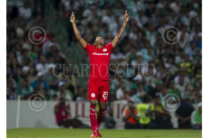 TORREÓN, COAHUILA, 17MAYO2018.- Luis Quiñones del equipo de los Diablos del Toluca, celebra el gol, ante el equipo de Santos, en el estadio Corona, partido correspondiente a la final de ida de la Clausura 2018 de la Liga MX. Marcador Final: Santos: 2 - Toluca: 1 FOTO: GABRIELA PÉREZ MONTIEL /CUARTOSCURO.COM