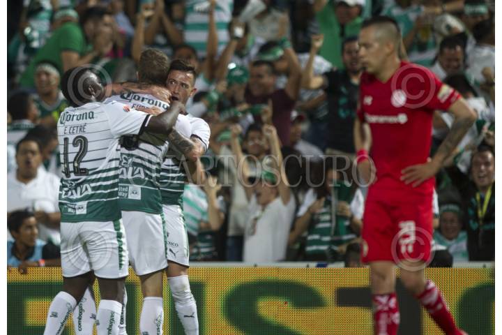 TORREÓN, COAHUILA, 17MAYO2018.- Jugadores del equipo de Santos, celebran el gol, ante el equipo de los Diablos del Toluca, en el estadio Corona, partido correspondiente a la final de ida de la Clausura 2018 de la Liga MX. Marcador Final: Santos: 2 - Toluca: 1 FOTO: GABRIELA PÉREZ MONTIEL /CUARTOSCURO.COM