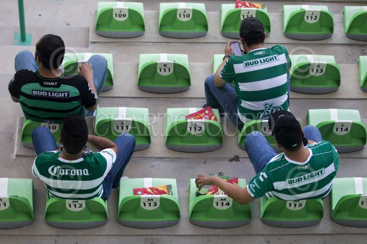 Aficionados del equipo de Santos, se instalan en las áreas destinadas para la sana distancia al inicio del partido en el estadio corona.
