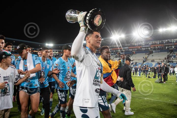 PACHUCA, HIDALGO, 01JUNIO2024. El equipo Pachuca se corona campeón de la Copa de Campeones Concacaf 2024, en el Estadio Hidalgo. El portero Carlos Moreno levanta la Copa de Campeones Concacaf 2024. FOTO: EDGAR NEGRETE LIRA/CUARTOSCURO.COM