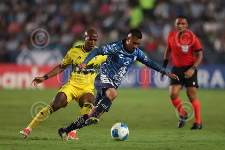PACHUCA, HIDALGO, 01JUNIO2024. Gustavo Cabral de los Tuzos disputa una pelota a Jacen Russell-rowe del Columbus durante la final de la Copa de Campeones Concacaf 2024 entre Pachuca vs Columbus Crew en el Estadio Hidalgo. FOTO: EDGAR NEGRETE LIRA/CUARTOSCURO.COM