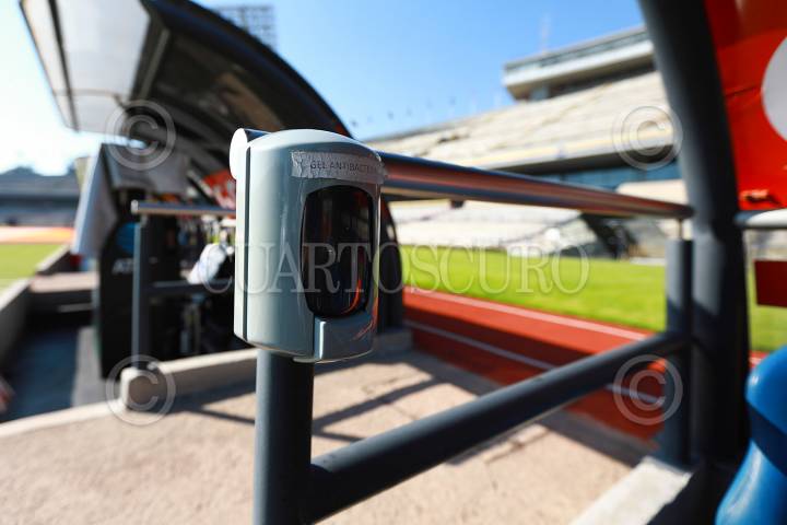 Un dispensador de gel antibacterial luce en el Estadio Olímpico Universitario.