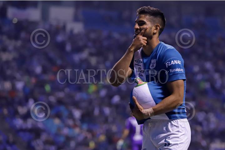 Diego de Buen festeja su gol durante el partido entre Puebla y Monterrey de la jornada 6 de la Liga Mx.