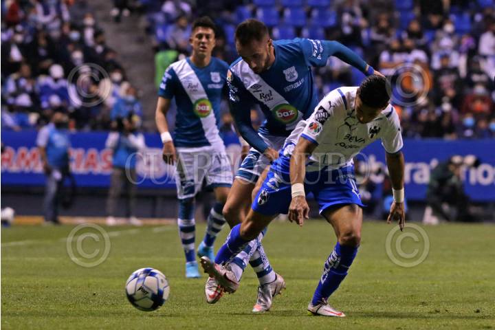 Federico Mancuello y Maximiliano Meza durante el partido entre Puebla y Monterrey durante la jornada 6 de la Liga Mx.