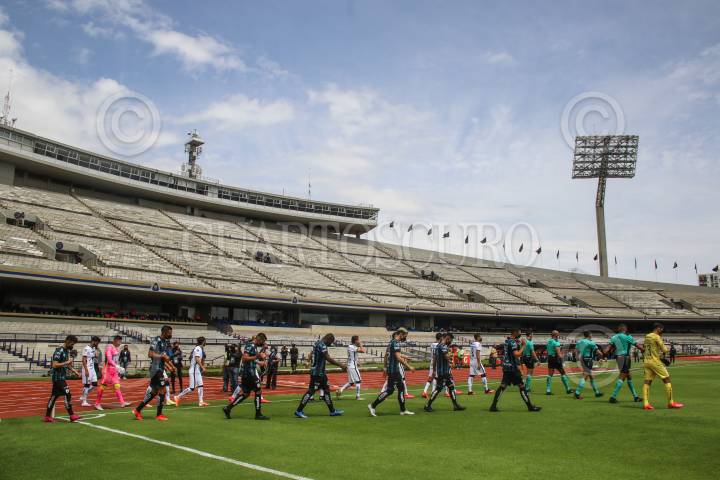 La Liga MX inició con estadios vacíos en cumplimiento de las restricciones sociales por la pandemia de Covid-19, en la imagen los Pumas y Gallos ingresan al estadio Olímpico.