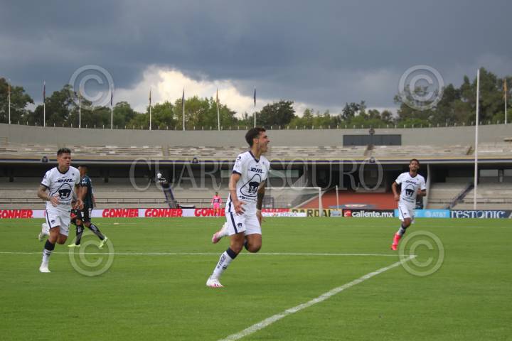 Sin afición con quien festejar Juan Ignacio Dinenno festeja el tercer gol de los Pumas, con lo que los locales se imponen 3-2 ante los Gallos del Querétaro.
