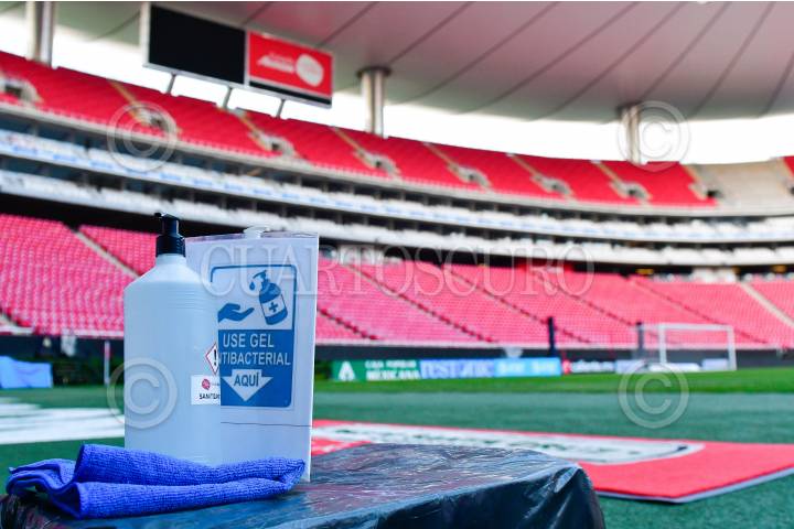 Gel antibacterial en el Estadio Akron como medida sanitaria por la pandemia de Covid-19.