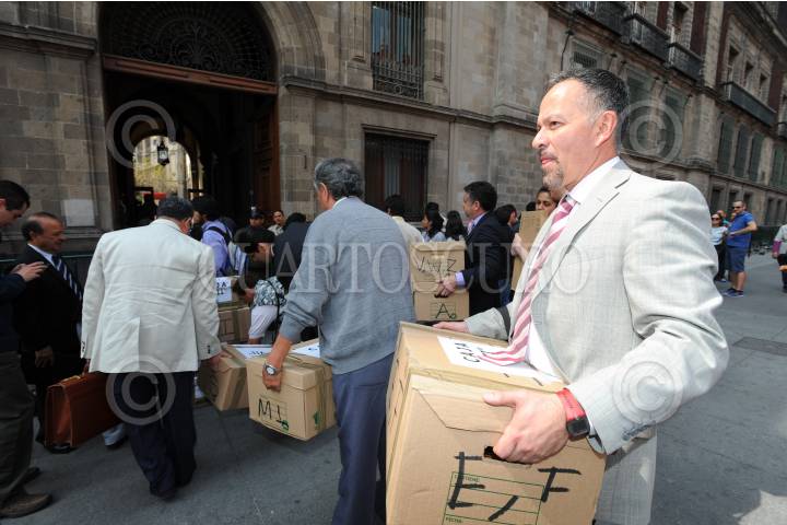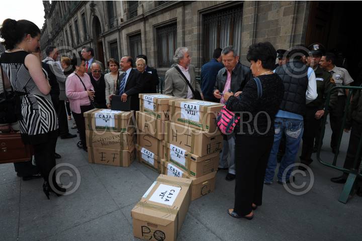 MEXICO, D.F., 10MARZO2015.- Ahorradores estafados por FICREA acudieron a las instalaciones de la Secretaría de Hacienda en el Palacio Nacional para hacer entrega de 12 cajas con expedientes de personas defraudadas. FOTO: LUIS CARBAYO /CUARTOSCURO.COM