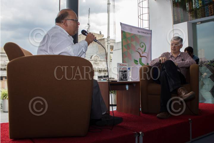 MEXICO, D.F., 13JUNIO2015.- Rafael Barajas "El Fisgón" y Alfonso Morales participaron en una mesa de dialogo en torno a la estrecha relación que Carlos Monsiváis mantuvo con la fotografía y la actividad de los fotógrafos mexicanos, en el marco del homenaje celebrado al autor a pocos días de su aniversario luctuoso. FOTO: DAVID POLO /CUARTOSCURO.COM