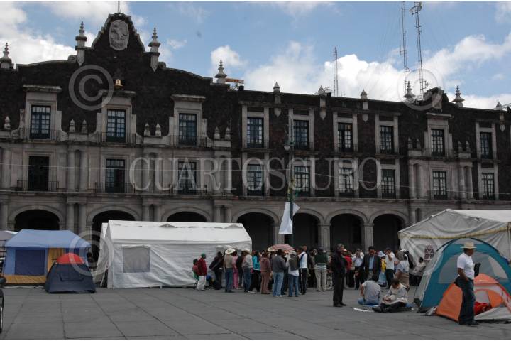 TOLUCA, ESTADO DE MÉXICO, 18SEPTIEMBRE2009.- Estudiantes de la universidad de Nezahualcóyotl y las preparatorioas de Chimalhuacán y San José del Rincón se plantaron frente al palacio de gobierno del estado de México en protesta por el incumplimiento en la otorgacion del registro ante la SEP y la Universidad estatal. Amenazaron con quedarse e instalaron tiendas de campaña hasta no ver resueltas sus demandas. FOTO: MARIO NULO/CUARTOSCURO.COM