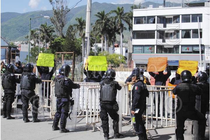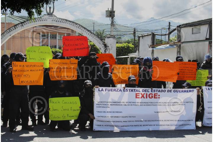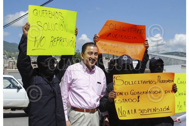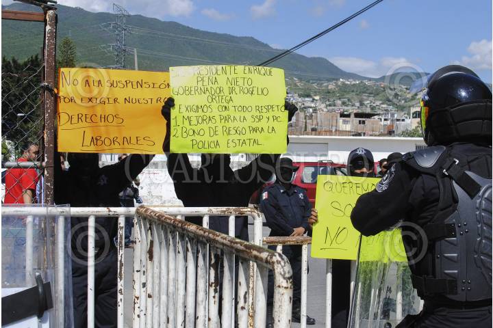 CHILPANCINGO, GUERRERO, 23JULIO2015.- Policías del estado en paro de labores, esta mañana acudieron a protestar al congreso del estado para exigir sus derechos laborales. Un grupo de policías estales con equipo antimotines impidieron el paso a sus compañeros. Durante la manifestación llego el presidente de la Comisión de Derechos Humanos, Ramón Navarrete Magdaleno, recibió un oficio con la petición de intervenir para que no se violen derechos laborales e individuales FOTO: JOSÉ I. HERNÁNDEZ /CUARTOSCURO.COM