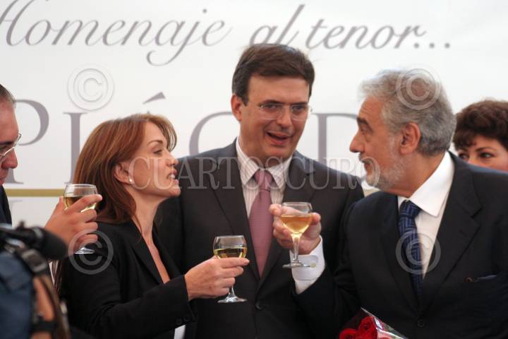 MÉXICO D.F. 20AGOSTO2007.-El tenor, Placido Domingo, asistió a la develación de la estatuta en su honor, realizada por el gobierno capitalino y la delegación Benito Juárez, esto en el Parque de los Venados.En la imagen Marigna Prats, acompañada de su esposo Marcelo Ebrad jefe de l gobierno capitalino brindan con el tenor Placido Domingo. FOTO: ISAÁC ESQUIVEL/CUARTOSCURO.COM