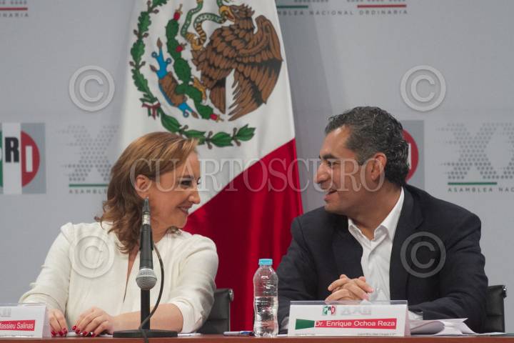 CIUDAD DE MÉXICO, 12AGOSTO2017.- Enrique Peña Nieto, Presidente de México, encabeza la 22 Asamblea Plenaria Ordinaria del Partido Revolucionario Institucional, en el Palacio de los Deportes. Durante los trabajos se votaron cambios a sus estatutos internos, como el de permitir que los candidatos presidenciales no cumplan con la militancia de diez años, como se pedía anteriormente. En la imagen los dirigentes tricolores Claudia Ruiz Massieu y Enrique Ochoa Reza. FOTO: MOISÉS PABLO /CUARTOSCURO.COM