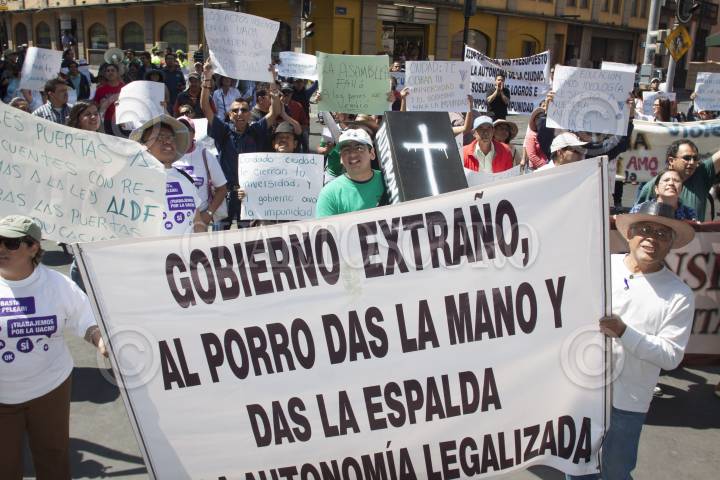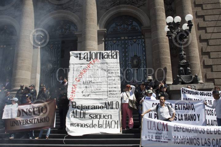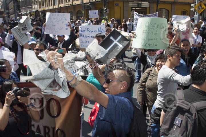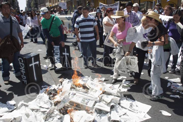 MÉXICO, D.F., 21FEBRERO2013.- Pasado el mediodía un grupo de estudiantes y profesores de la Universidad Autónoma de la Ciudad de México marcharon del Monumento a la Revolución a la se de legislativa del DF, ahí manifestaron su apoyo a la rectora Esther Orozco, quien fue destituida de su cargo por parte del consejo universitario el día de ayer, en su protesta los profesores y alumnos quemaron ejemplares del periódico "La Jornada", a quien acusaron de ser parcial en información acerca del conflicto. FOTO: MOISÉS PABLO /CUARTOSCURO.COM