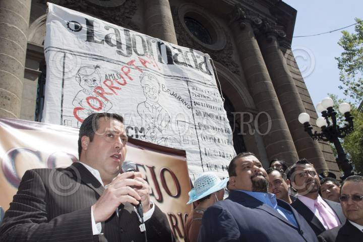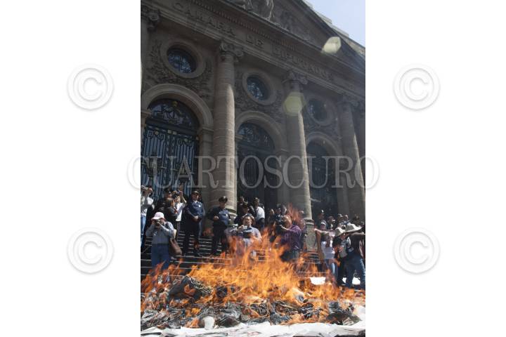 MÉXICO, D.F., 21FEBRERO2013.- Tonatiuh González Case, diputada local del PRI, y Cuauhtémoc Gutiérrez de la Torre, presidente del PRI, se pronunciaron en contra del exhorto a renunciar a la rectoría de la UACM por parte de Esther Orozco, en la sesión del día de ayer en la Asamblea Legislativa. Pasado el mediodía un grupo de estudiantes y profesores de la Universidad Autónoma de la Ciudad de México marcharon del Monumento a la Revolución a la se de legislativa del DF, ahí manifestaron su apoyo a la rectora Esther Orozco, quien fue destituida de su cargo por parte del consejo universitario el día de ayer, en su protesta los profesores y alumnos quemaron ejemplares del periódico "La Jornada", a quien acusaron de ser parcial en información acerca del conflicto. FOTO: MOISÉS PABLO /CUARTOSCURO.COM