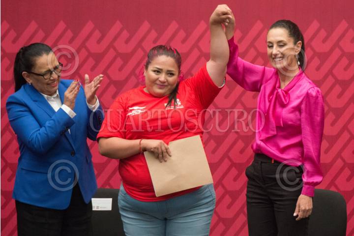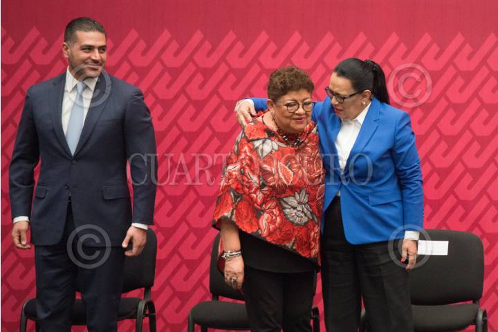Ernestina Godoy Ramos, Fiscal General de Justicia de la Ciudad de México, Rosa Icela Rodríguez, secretaria de Seguridad y Protección Ciudadana del Gobierno de México; Claudia Sheinbaum Pardo, jefa de Gobierno, y Rafael Guerra Álvarez, magistrado Presidente del Poder Judicial de la Ciudad de México, durante la Segunda Ceremonia de Entrega de Reconocimientos a Personas Beneficiarias de la “Estrategia Reconecta con La Paz”.