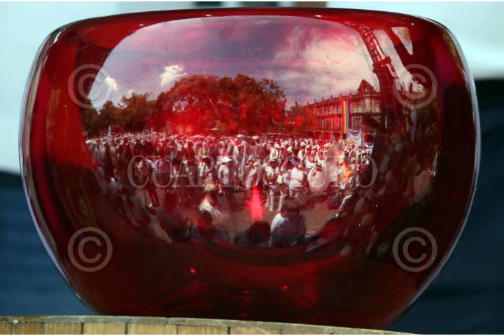 Reflejo en una gran lampara de la concentración de miles de católicos en el zócalo que hoy participaron en la Octava Caminata por la Paz convocada por la Diocesis de Cuernavaca.