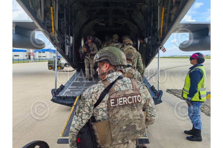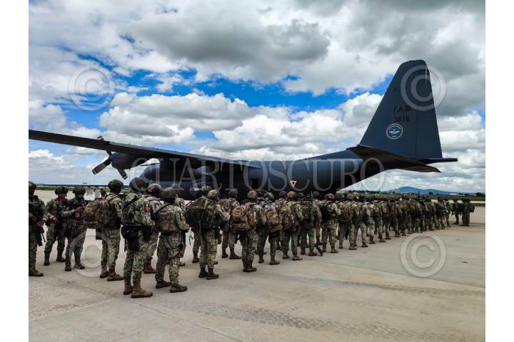 SANTA LUCÍA, ESTADO DE MÉXICO, 28JULIO2025.- 90 efectivos de Fuerzas Especiales del Ejército Mexicano abordaron una aeronave modelo Hércules en la Base Militar de Santa Lucia rumbo a Culiacán para reforzar la Estrategia Nacional de Seguridad. Estos efectivos se suman a las unidades de Fuerzas Especiales y de Fusileros Paracaidistas que el pasado 22 y 23 de julio de 2025, se incorporaron al despliegue operativo de la 9/a. Zona Militar en esa entidad. FOTO: SEDENA/CUARTOSCURO.COM